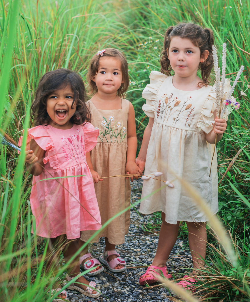 Linen is woven from fibers of the flax plant. Thus making it a plant based natural fibre, good for your kids skin as well as the earth. flax cultivation requires minimal water and pesticides, making linen a planet-friendly choice