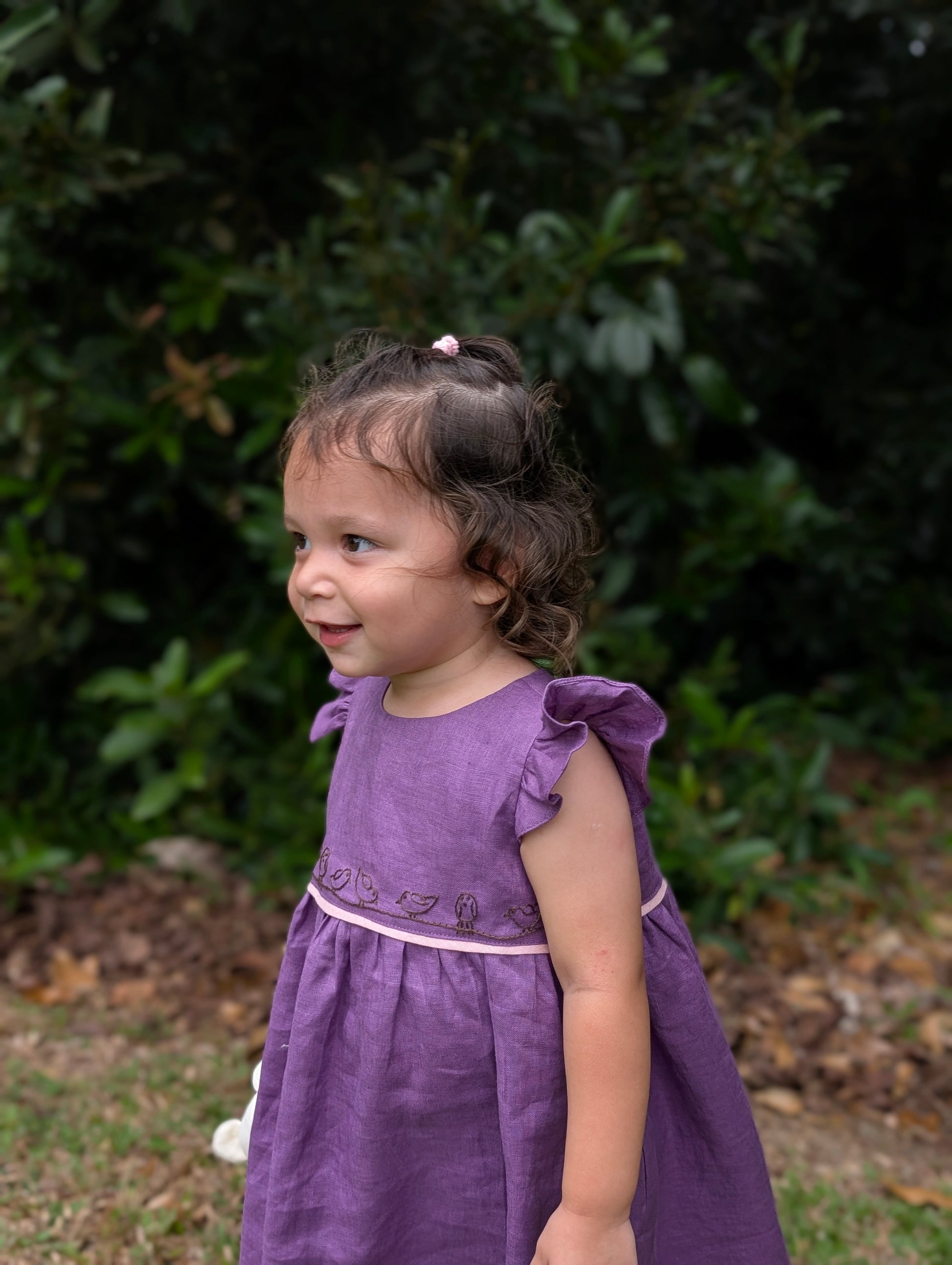 A sweet and charming piece for little adventurers. The Bird Song Dress features delicate ruffle sleeves and subtle bird embroidery along the waist for a playful touch. Designed in a rich deep purple color and crafted from breathable, gentle linen, it’s perfect for outings offering effortless style and comfort.