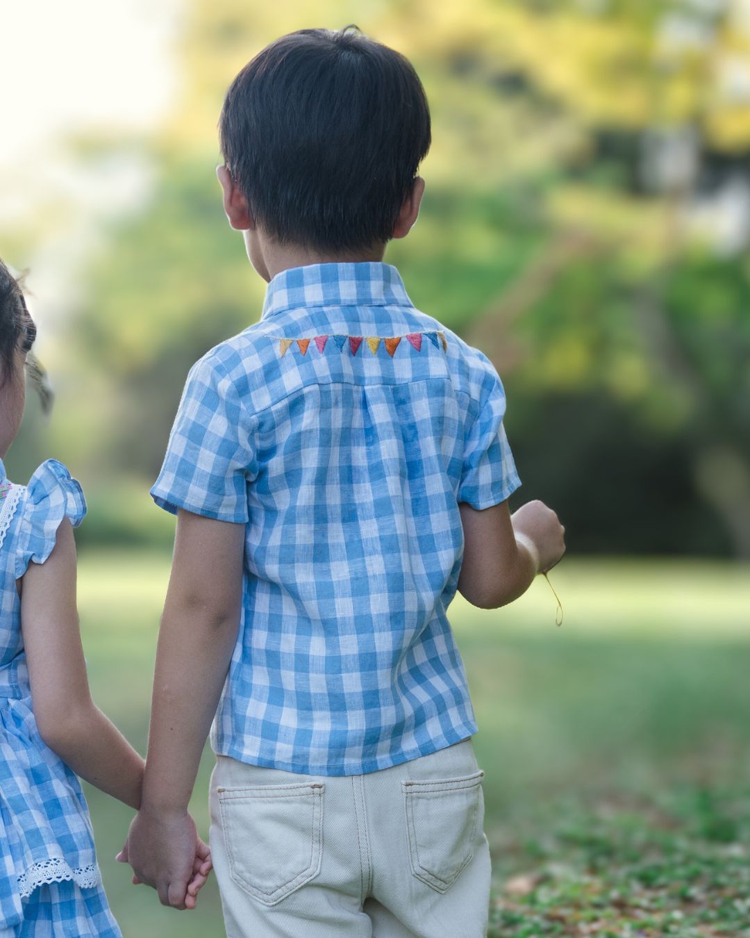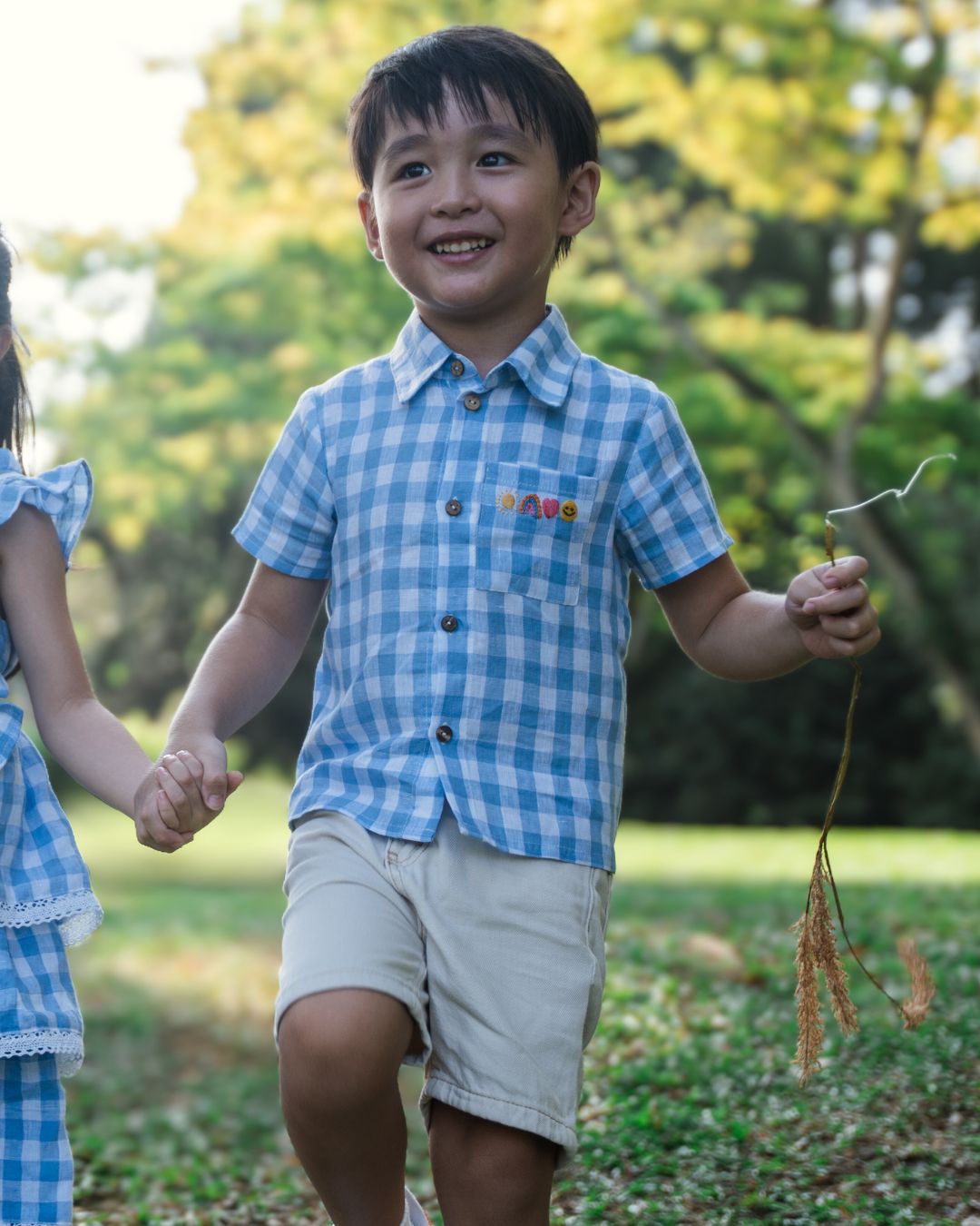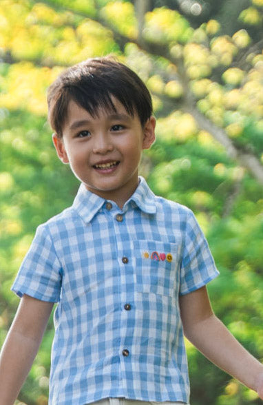 Handsome meets happy! This charming blue gingham shirt features a playful smiley face embroidery that brings instant joy to any outfit. The classic button-up design and comfortable short sleeves make it perfect for school days, family outings, or whenever your little gentleman wants to look sharp while staying comfortable.