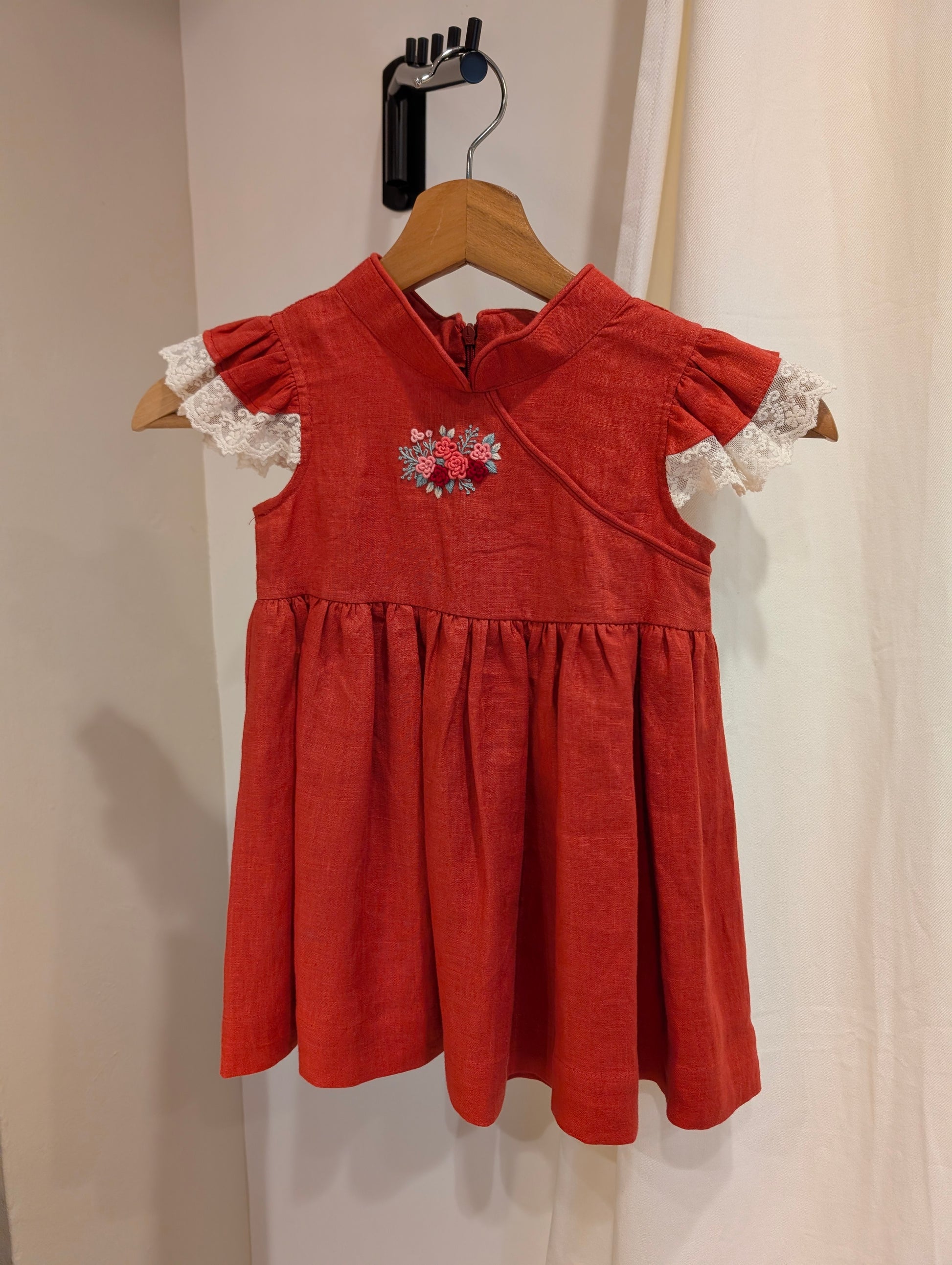 Our CNY Red Rosy Dress is adorned with delicate floral hand-embroidery, making it the perfect choice for your girl's CNY occasion. Super elegant, pretty, and comfortable, it’s crafted from 100% pure linen fabric, breathable and gentle on your child’s skin.