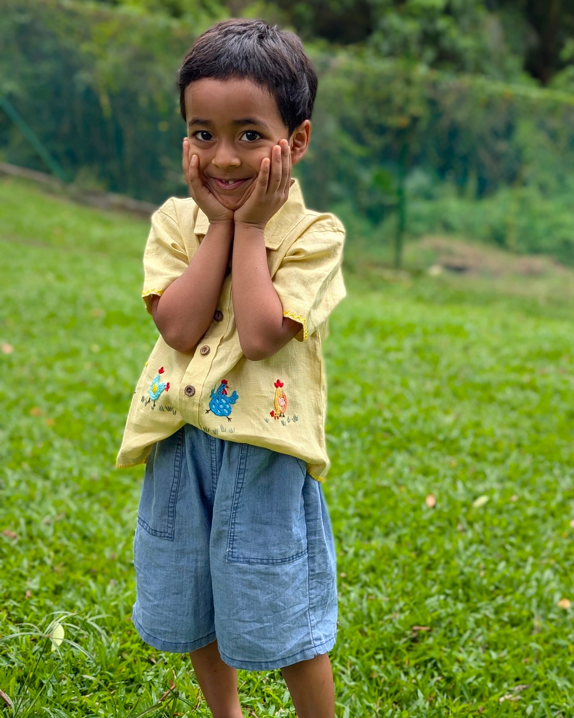 A fun statement piece for your little explorers. The Crazy Chicken Shirt is crafted from 100% pure linen for breathability, comfort, and a gentle feel on the skin. Featuring colorful hand-embroidered chickens on a cheerful yellow fabric, it’s a playful yet stylish choice to pair with jeans or shorts for an easygoing outfit.