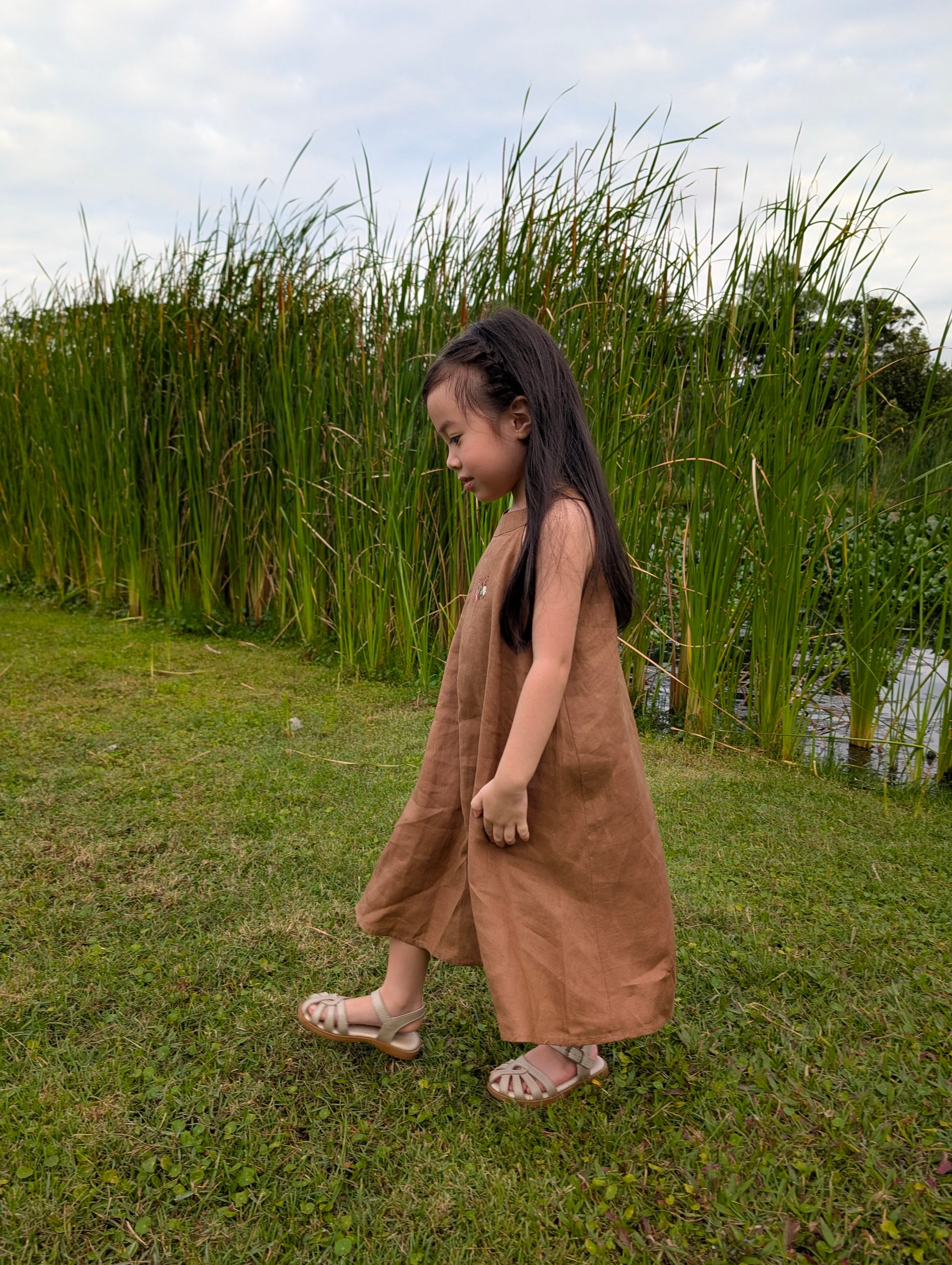 Timeless simplicity with a touch of nature. The Earthy Grace Dress features a classic A-line silhouette, a halter neckline, and delicate floral embroidery at the center chest. Designed in an earthy brown hue and crafted from breathable linen, this sleeveless twinning set is perfect for effortless, put-together looks. Ideal for warm days and special matching moments.