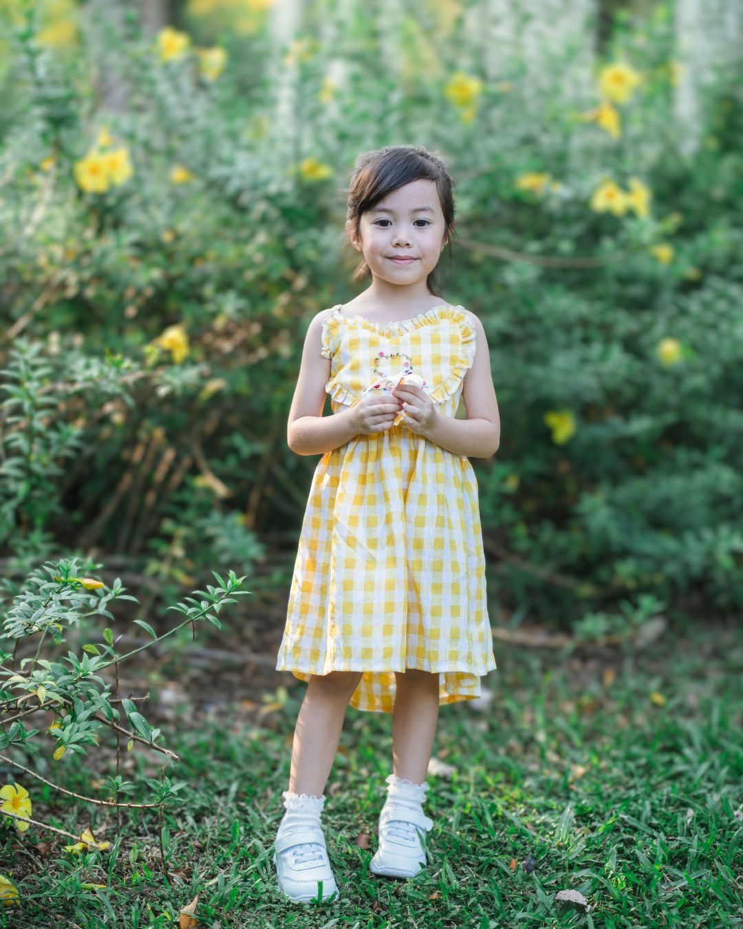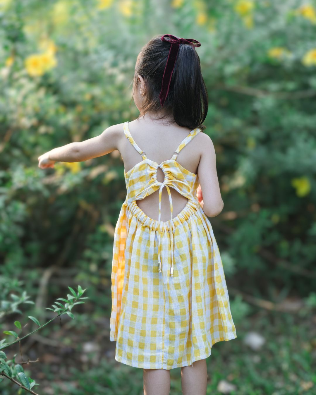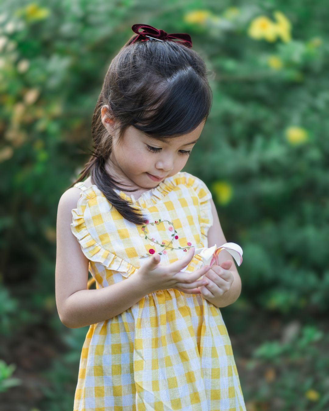 Brighten her day with the charm of the Golden Heart Dress, a sunshine-inspired piece made for twirls and giggles. Crafted from 100% pure linen, this yellow gingham dress features a soft ruffled neckline and a delicate floral heart embroidery at the chest — a sweet symbol of joy and love. Lightweight, breathable, and kind to delicate skin, it's perfect for sunny days, birthday parties, or just everyday play.
