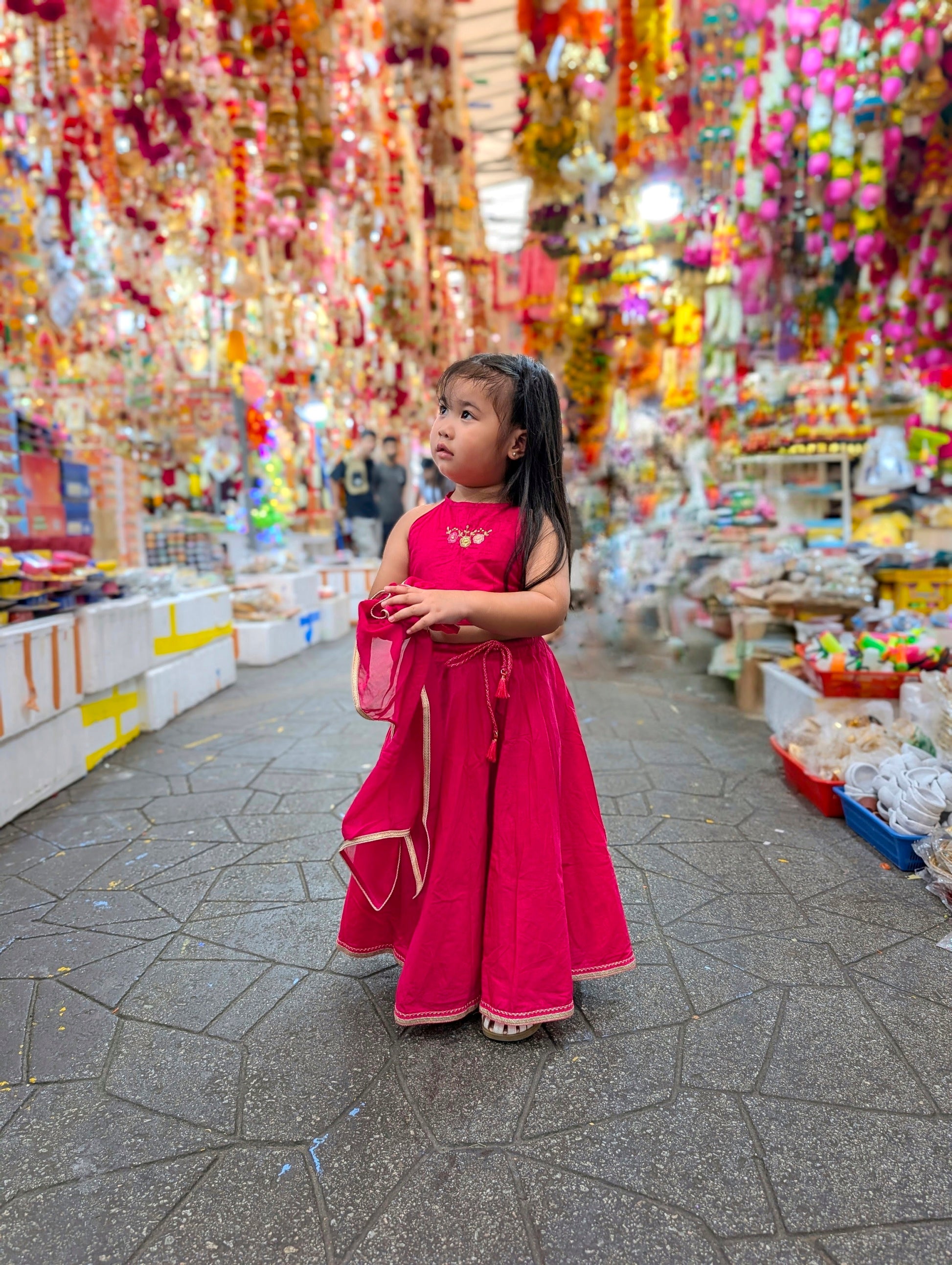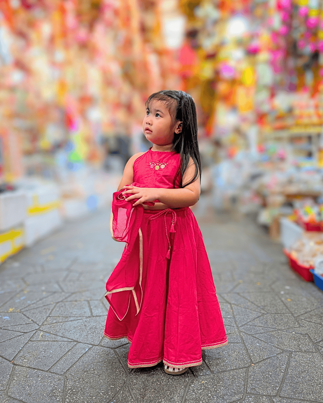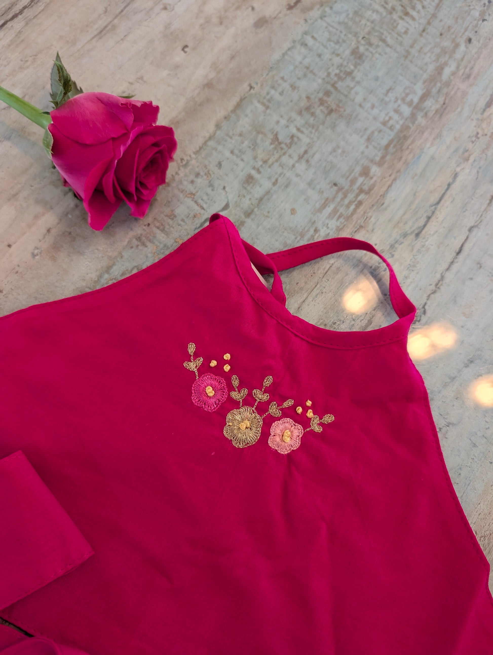 Adjustable halter tie, 100% mulmul cotton, lightweight, breathable, and gentle on delicate skin. Features precise hand embroidery on the top and flowing skirt with soft dupatta—comfortable and perfect for Diwali, weddings, and festive celebrations.