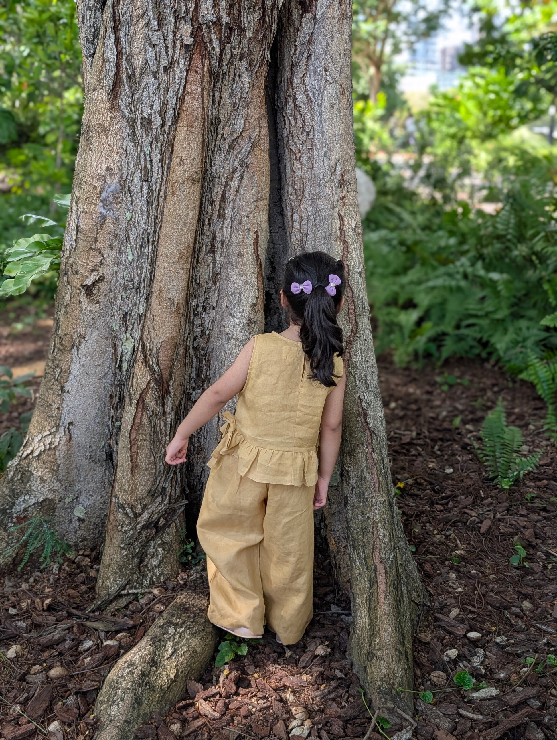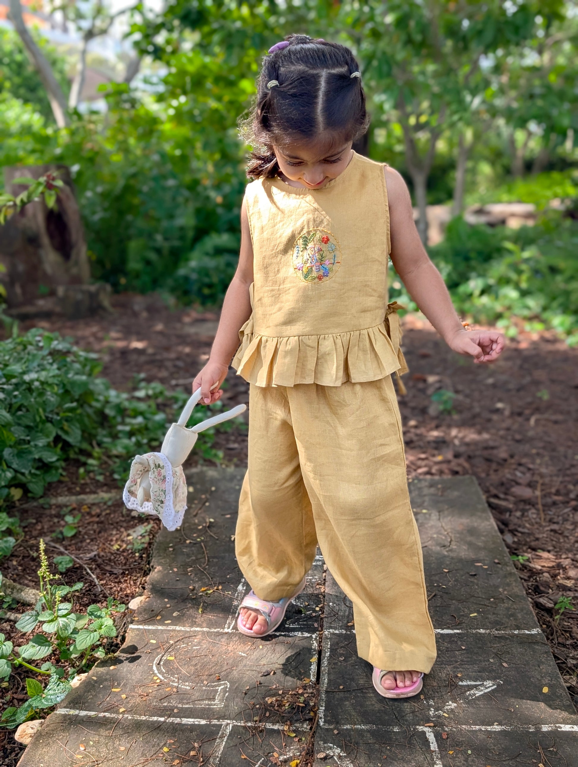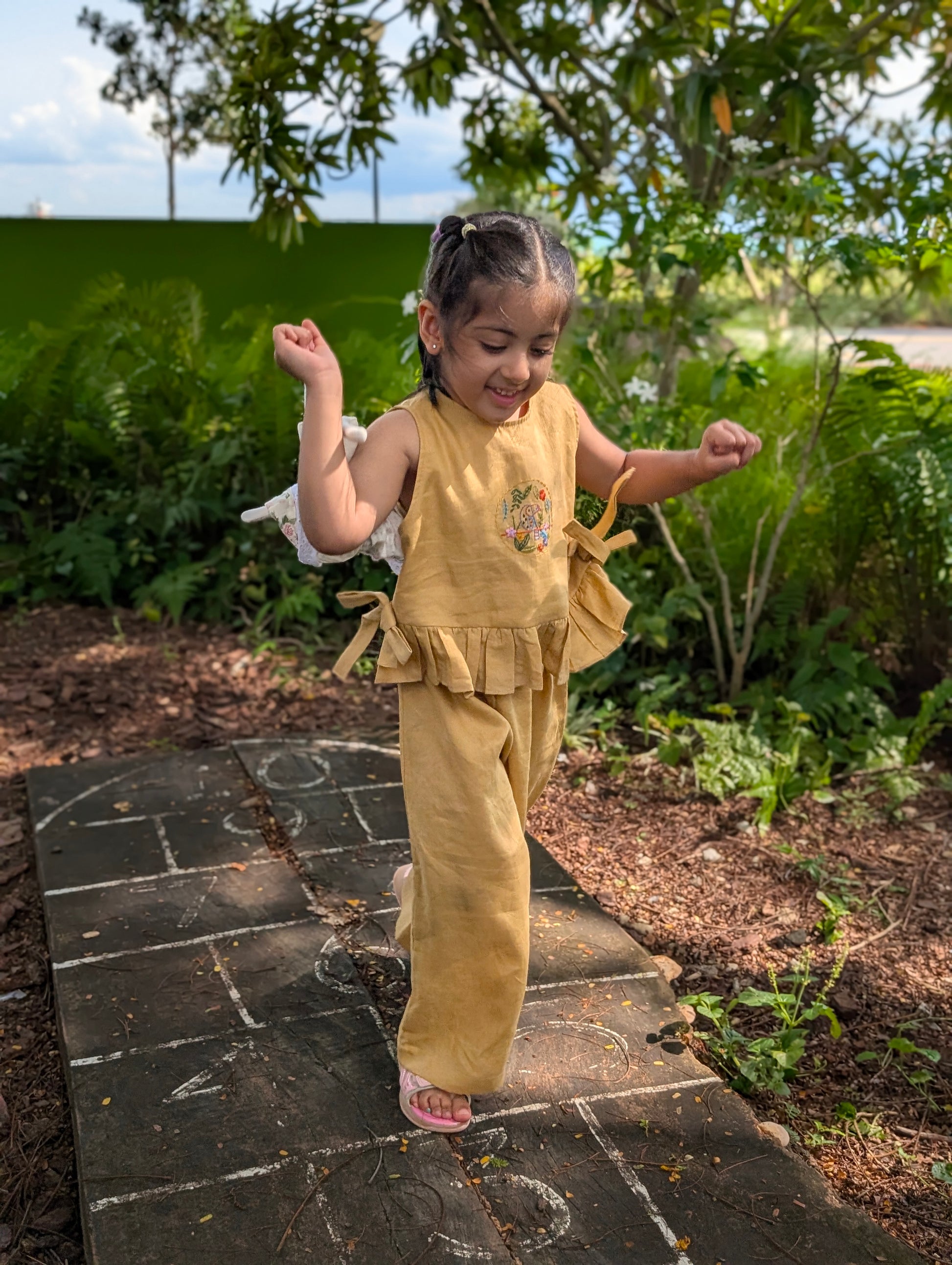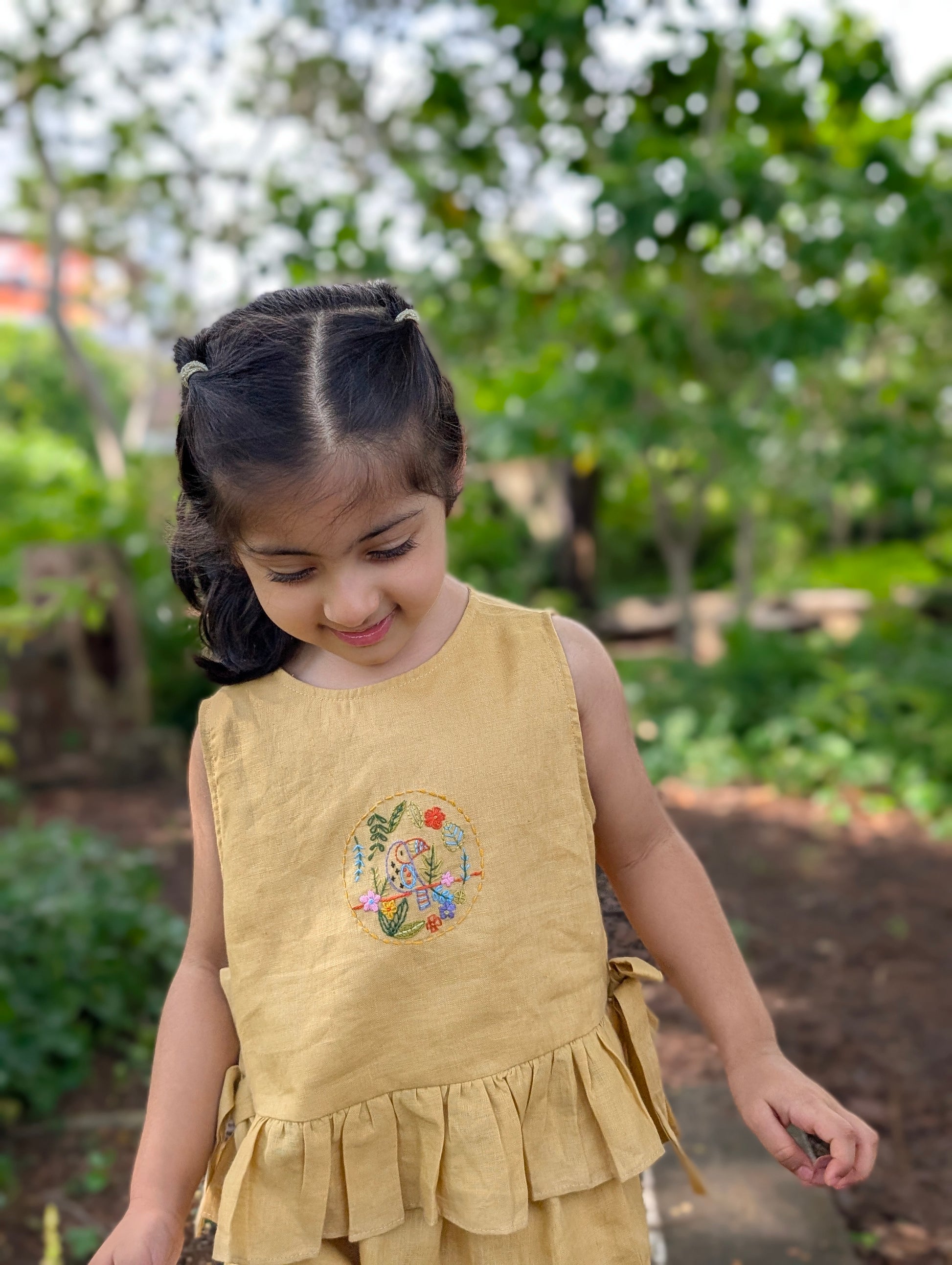 A breezy set for sunny days. The Parakeet's Song set features a sleeveless top in a warm mustard yellow, adorned with a charming hand-embroidered parrot and florals at the center. Delicate ruffles and side bows add a flattering touch, while the full-length pants complete the effortlessly beautiful look. Perfect for both playtime and outings.