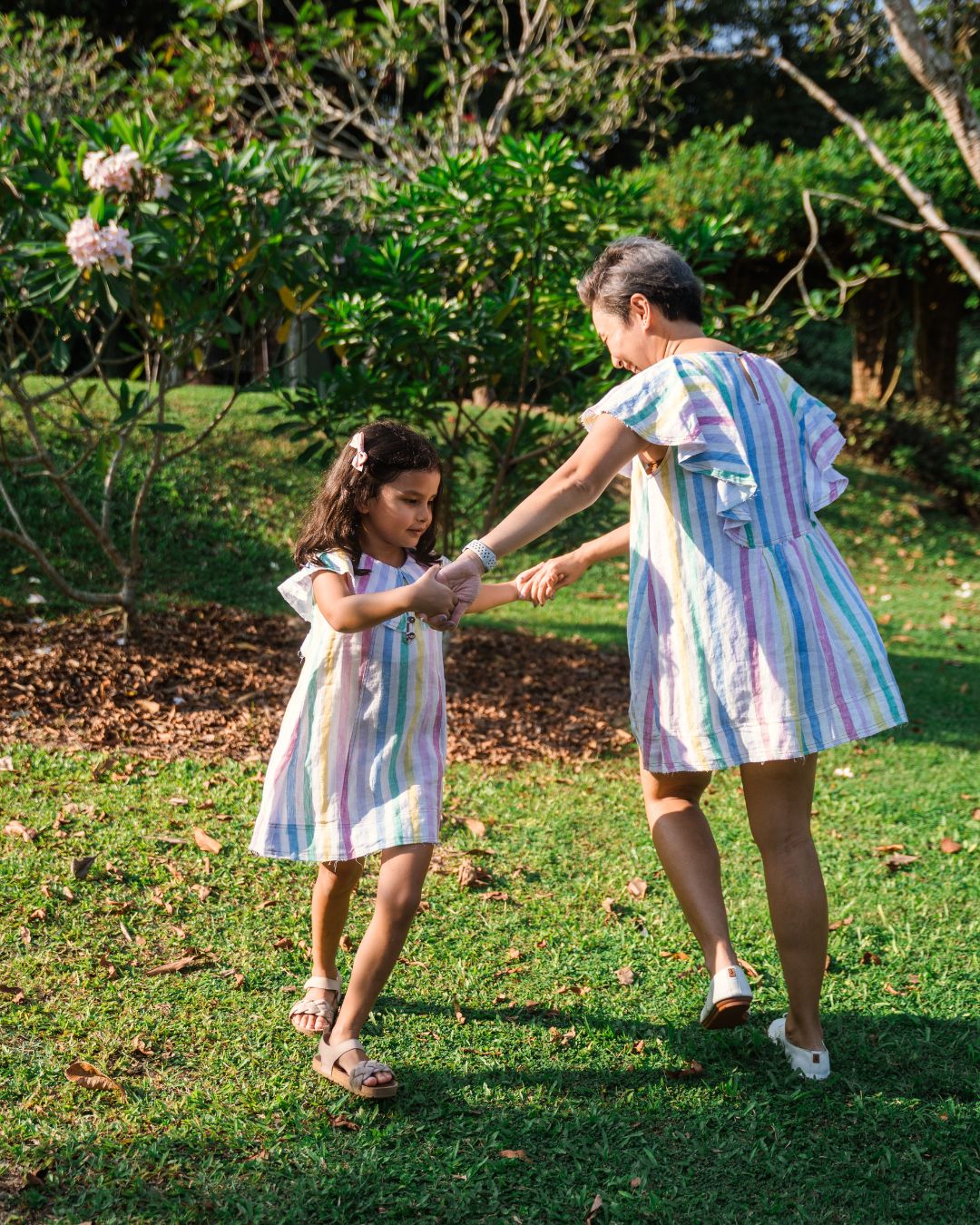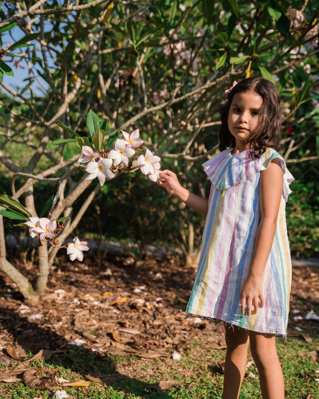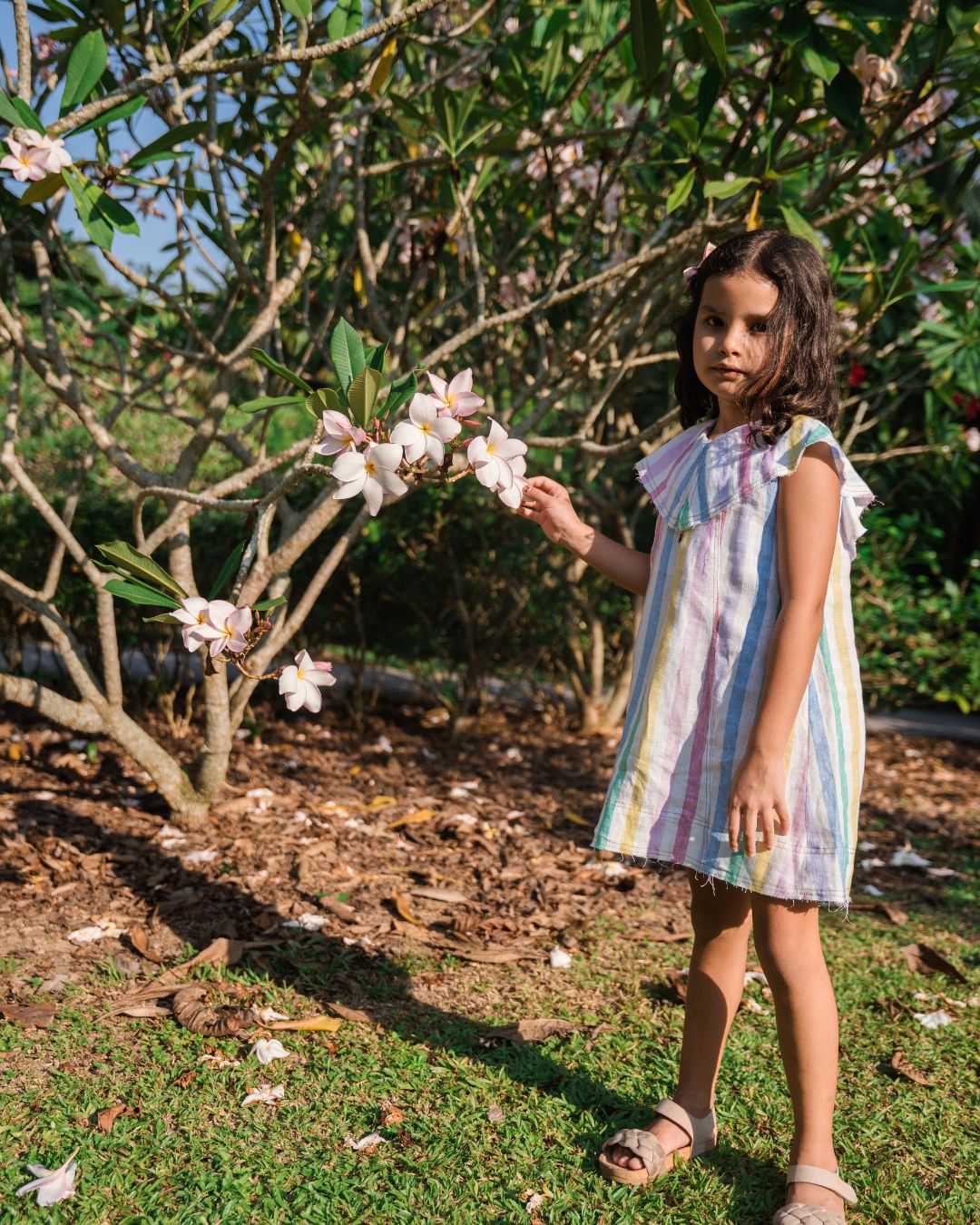 Pure joy in every stripe! This delightful rainbow dress captures childhood wonder with its vibrant vertical stripes and sweet bow detail at the neck. The sleeveless A-line design offers freedom of movement for dancing, playing, and celebrating life's colorful moments—perfect for parties, playdates, or any day that calls for extra happiness.