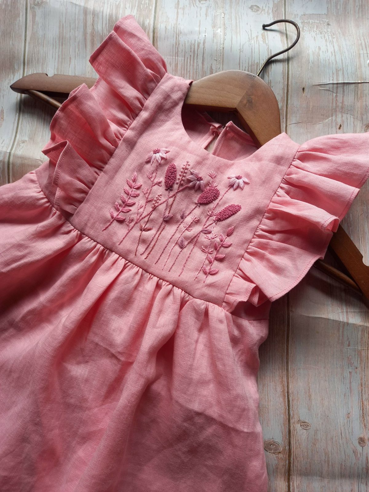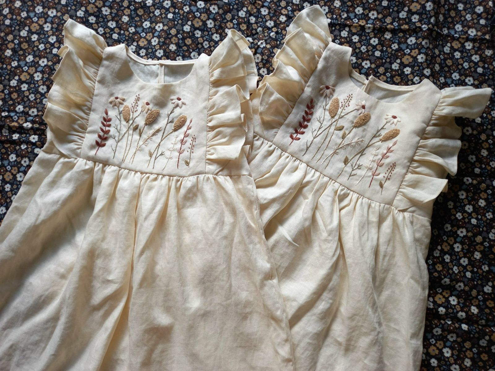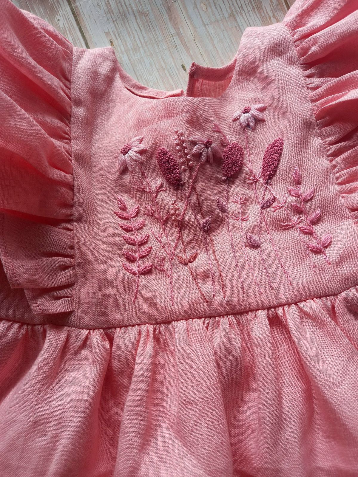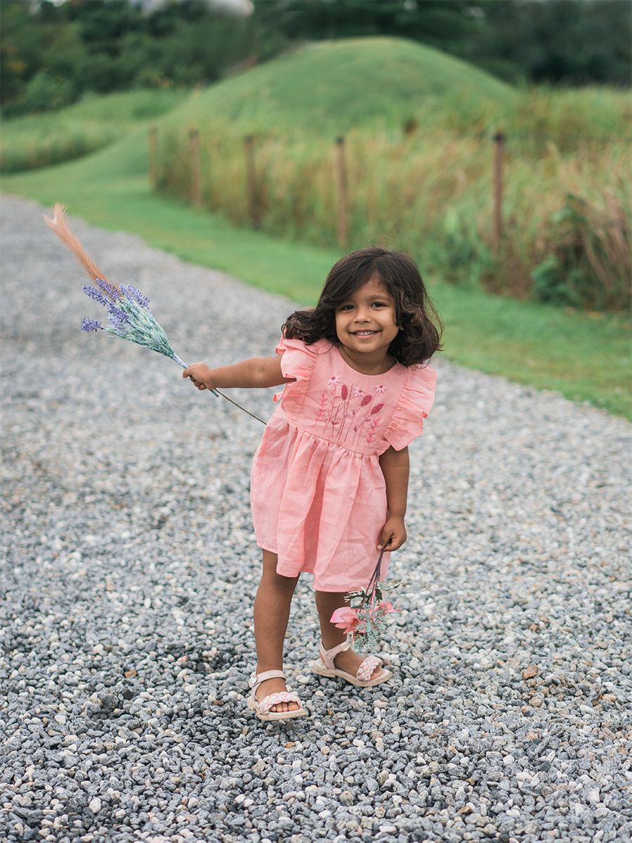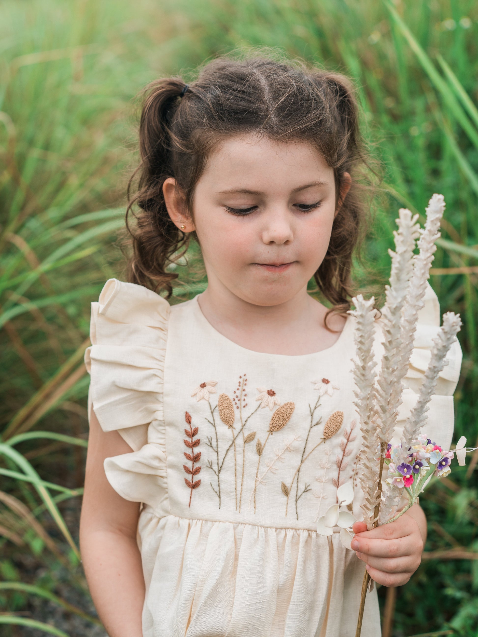Wildflower Blush Dreams, where pure soft linen meets sustainable chic design. Crafted with natural and breathable fabric, it's a comfort-forward style for our little ones to embrace eco-conscious fashion effortlessly. Featuring beautiful hand-embroidered flowers and ruffle sleeves, this dress is great for that unique look at a party or a beautiful day out!