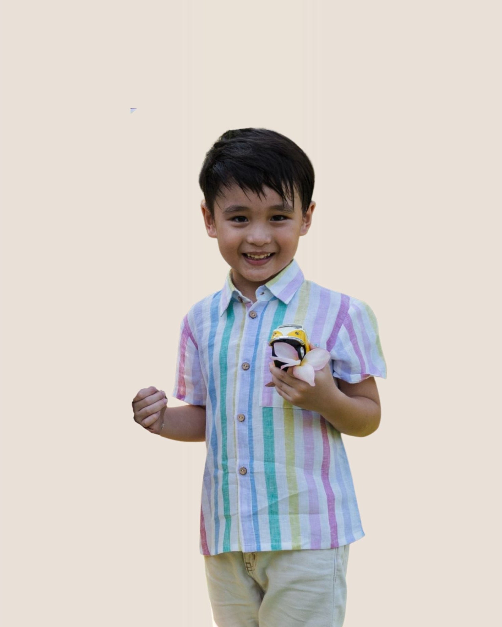 Let your little one race into style with this bright and bold rainbow-striped shirt, crafted from 100% pure linen for all-day comfort. Perfect for sunny days, birthday parties, and family outings.
